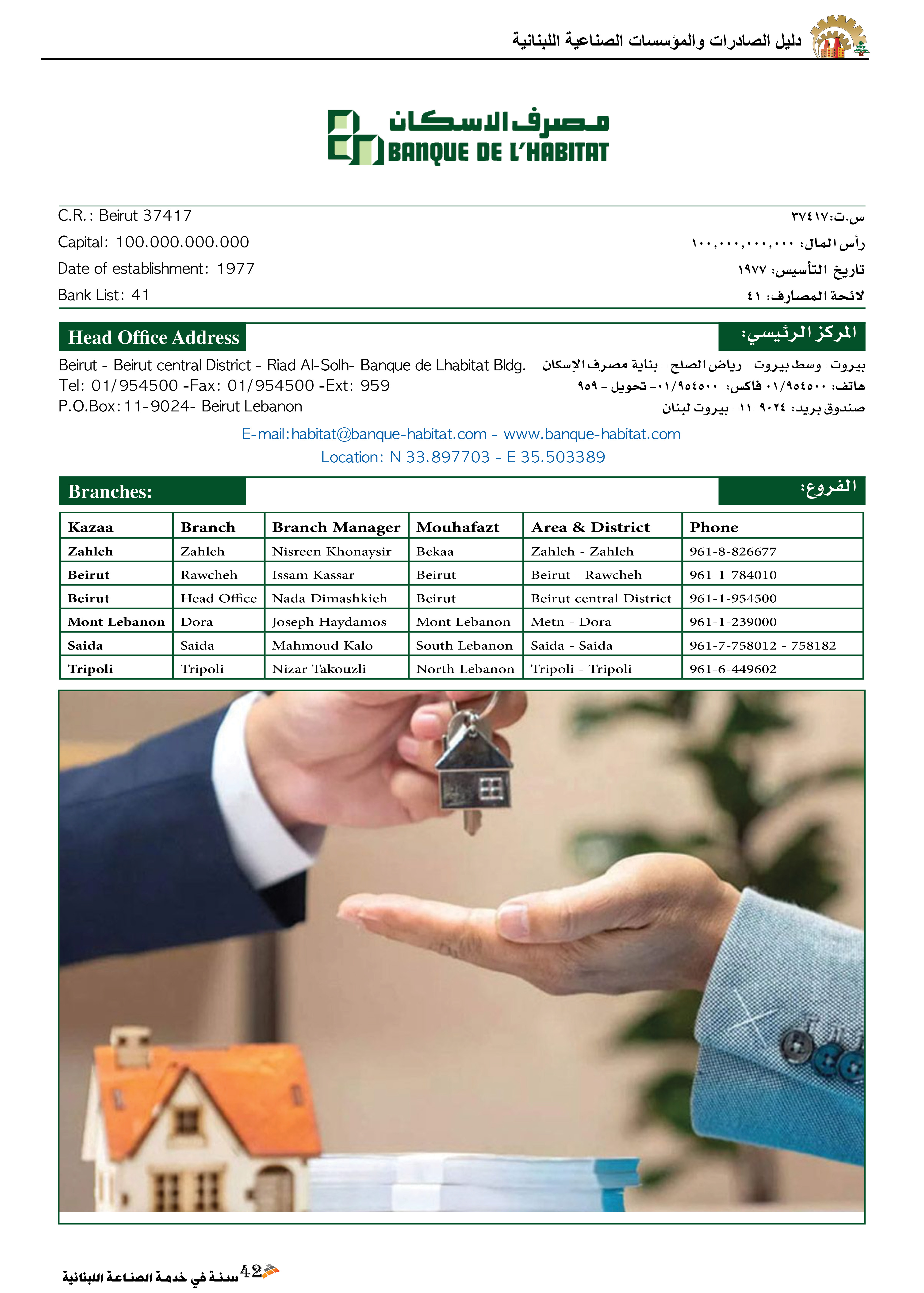 | Head Office | Beirut | Beirut | Beirut central District | Riad Al Solh | Nada Dimashkieh | Banque de L`habitat | 01/954500 | |